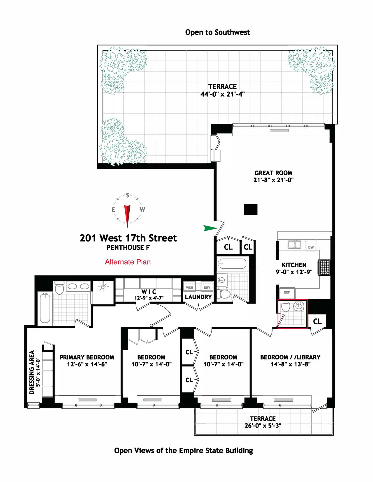 201 West 17th Street has a live-in superintendent, 24-hour doorman, rooftop terrace for residents, bike room, and private storage for apartment PHF.