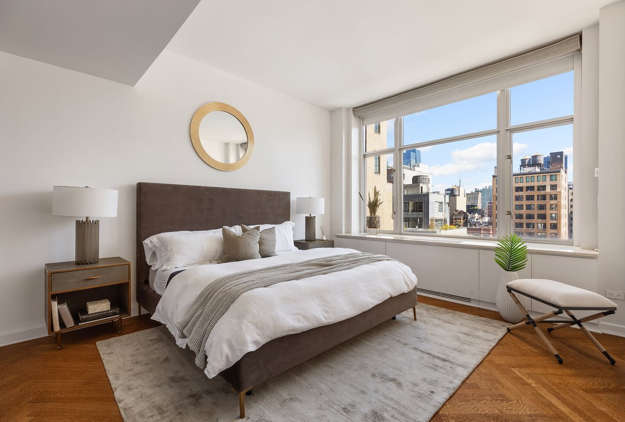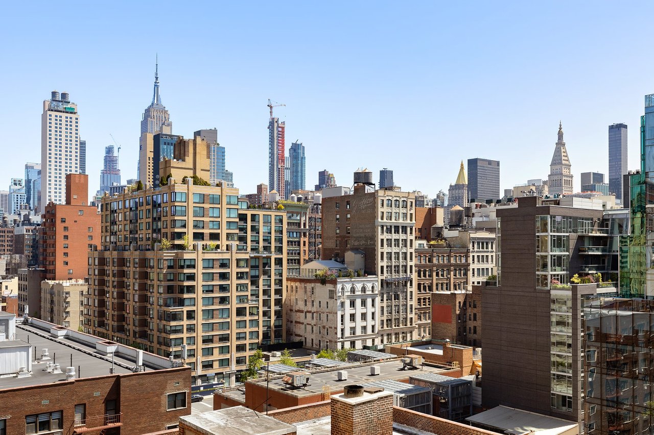 Oversized windows and 10’ ceilings allow for immediate open views over Chelsea and north to The Empire State Building. Every room has exciting exposures. Gorgeous oak herringbone floors are enhanced in the all-day light. Expertly designed, there are mechanical blinds and solar shades throughout, programmable on one's phone. In addition, there is a Nest system that controls the HVAC.